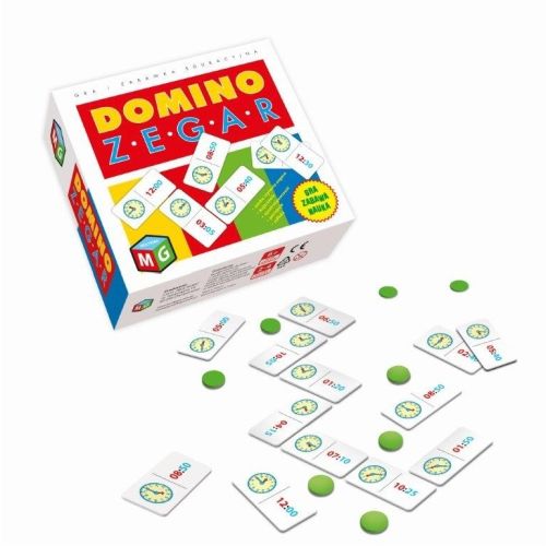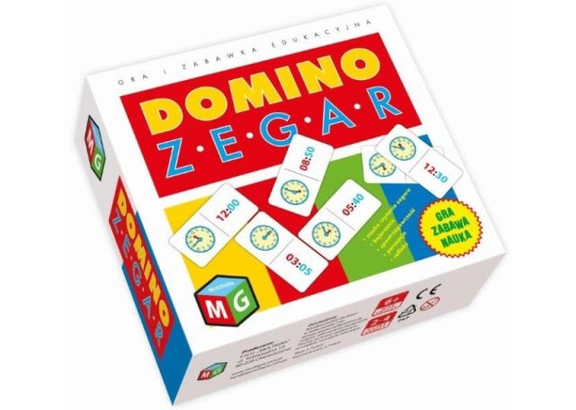 DOMINO ZEGAR to zabawka i gra, która jest doskonałą rzrywkągłównie dla młodszych dzieci, uczących się czytać wskazania na tarczy zegarowej. W czasie zabawy lub grając w domino, dzieci ćwiczą i utrwalają umiejętność określania czasu według pozycji wskazówek i zapisu, jednocześnie biorą udział w emocjonujacej rywalizacji trenując swój refleks, spostrzegawczość i umiejętność właściwego kojarzenia.Zawartość pudełka: 28 elementów domina, 40 szt żetonów, instrukcja.