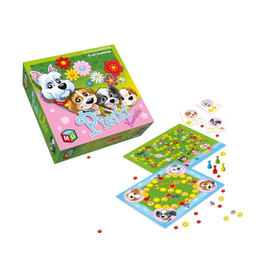 estaw zawiera 2 gry planszowe: PIESKI- wyprowadź swojego pieska na spacer. Czy uda mu się spotkać swojego dobrego przyjaciela, czy będzie potrafił złapać swoją piłeczkę? KWIATKI - to łatwa, zapewniająca dobrą, wesołą zabawę, gra dla najmłodszych. Która z dziewczynek zbierze najszybciej lub najwięcej kwiatków? Zestaw zawiera: plansze- 1 szt, pionki- 4 szt, żetony plastikowe- 20szt, kostkę do gry - 1 szt, tabliczki z pieskiem - 4szt, żetony tekturowe- 12szt, instrukcje.