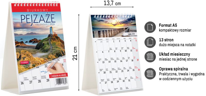 🌅 Kalendarz biurkowy O-PRESS A5 miesięczny Pejzaże 2026