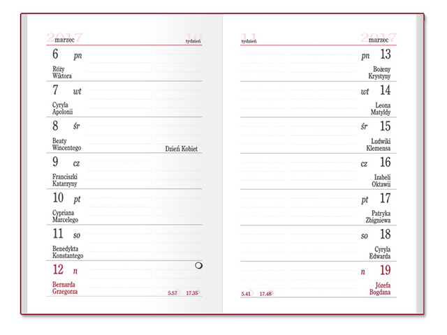 Kalendarium: w języku polskim, numeracja tygodni, wschody i zachody Słońca, fazy Księżyca, podwójne imieniny