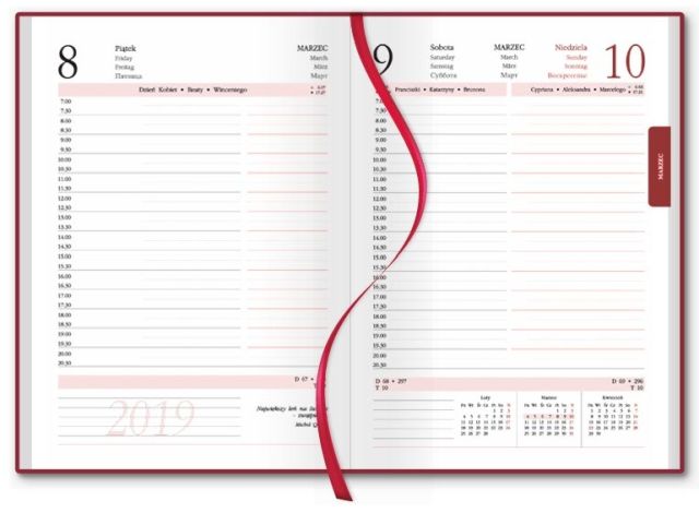 Układ: 1 dzień na stronieDruk, papier: 2 kolory, papier 70 g/m2 w kolorze białym