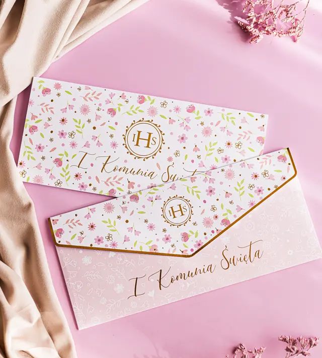 Podkreśl wyjątkowy charakter Pierwszej Komunii Świętej dzięki eleganckiemu karnetowi PREMIUM. Połączenie ozdobnej złoconej koperty oraz kartki ze złoconymi życzeniami tworzy luksusową i wyjątkową pamiątkę. Delikatny nadruk pastelowych kolorowych kwiatów oraz złocona hostia nadają kartce subtelnej elegancji i podkreślają sakralny wymiar uroczystości.