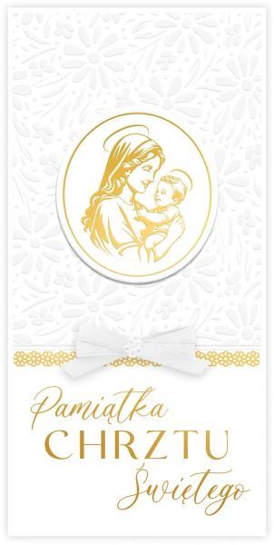 Producent: Kartki z KotkiemKartka DL-R na Chrzest Święty w klasycznym połączeniu bieli i złota. Na froncie dominuje złoty medalik z wizerunkiem Maryi z Dzieciątkiem, który nadaje kartce podniosły, pamiątkowy ton. Tło jest jasne i dekoracyjne — widoczny jest delikatny wzór wytłaczanych roślinnych motywów, a całość spina satynowa kokardka w bieli. Napis „Pamiątka Chrztu Świętego” jest duży i czytelny, dzięki czemu kartka świetnie prezentuje się również jako elegancki dodatek do prezentu.