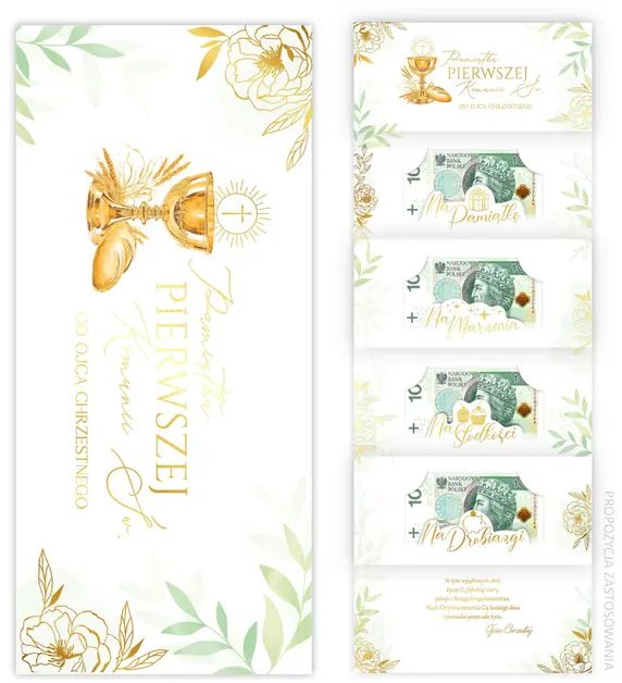 Karnet premium – elegancka i efektowna forma prezentu komunijnego.4 kieszonki na banknoty – przeznaczone na banknoty od 10 do 500 zł.Złocone elementy – złocony kielich eucharystyczny i napisy.Gotowe życzenia w środku – elegancki tekst komunijny podkreślający charakter uroczystości.Format DL z kopertą – wygodny i popularny format prezentowy.