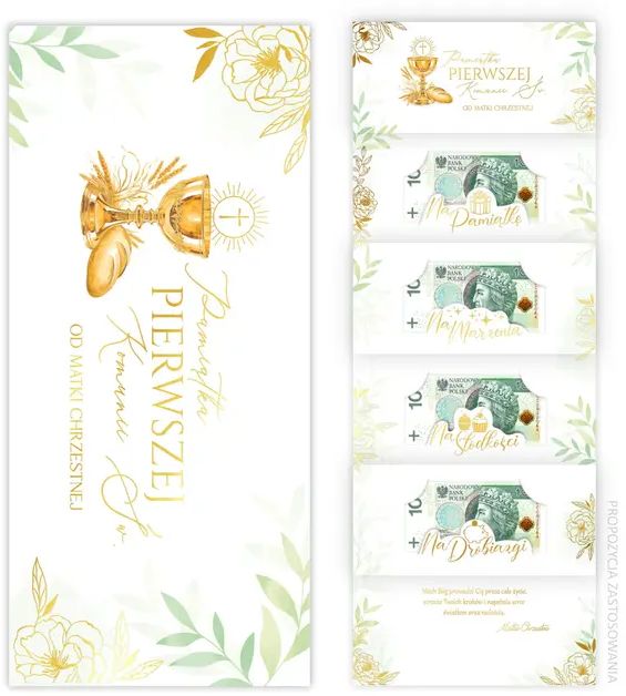 Karnet premium – elegancka i efektowna forma prezentu komunijnego.4 kieszonki na banknoty – przeznaczone na banknoty od 10 do 500 zł.Złocone elementy – złocony kielich eucharystyczny i napisy.Gotowe życzenia w środku – elegancki tekst komunijny podkreślający charakter uroczystości.Format DL z kopertą – wygodny i popularny format prezentowy.