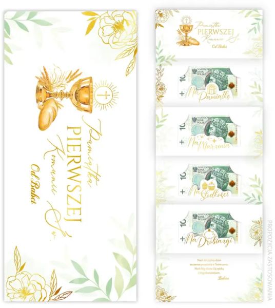 Producent: Kartki z KotkiemKarnet premium – elegancka i efektowna forma prezentu komunijnego.4 kieszonki na banknoty – przeznaczone na banknoty od 10 do 500 zł.Złocone elementy – złocony kielich eucharystyczny i napisy.Gotowe życzenia w środku – elegancki tekst komunijny podkreślający charakter uroczystości.Format DL z kopertą – wygodny i popularny format prezentowy.