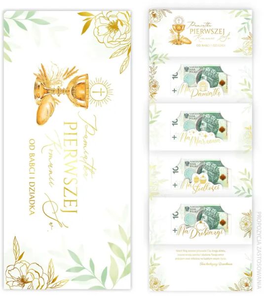 Producent: Kartki z KotkiemKarnet premium – elegancka i efektowna forma prezentu komunijnego.4 kieszonki na banknoty – przeznaczone na banknoty od 10 do 500 zł.Złocone elementy – złocony kielich eucharystyczny i napisy.Gotowe życzenia w środku – elegancki tekst komunijny podkreślający charakter uroczystości.Format DL z kopertą – wygodny i popularny format prezentowy.