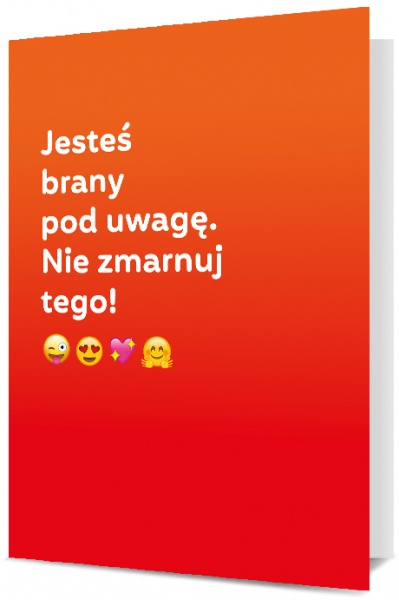 W środku życzenia, dołączona kolorowa koperta kolorystycznie komponująca się z karnetem.