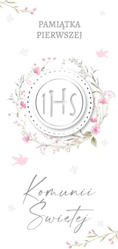 Subtelna i elegancka kartka na Pamiątkę Pierwszej Komunii Świętej, zaprojektowana z myślą o dziewczynkach. Delikatne różowe akcenty w postaci kwiatowych zdobień i ptaszków nadają kartce wyjątkowy, dziewczęcy charakter. Centralnym elementem jest hostia z symbolem IHS, ozdobiona przestrzennym wieńcem, który podkreśla duchowy wymiar uroczystości. Złocenia i elementy 3D dodają kartce prestiżowego wyglądu.
