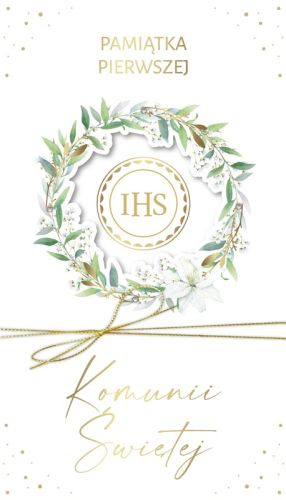 Ekskluzywna kartka na Pamiątkę Pierwszej Komunii Świętej, ozdobiona złoceniami, kryształkami oraz dekoracyjnym złotym sznureczkiem, który dodaje jej elegancji i wyjątkowego wyglądu. Centralny motyw przedstawia hostię IHS, otoczoną subtelnym, kwiatowym wieńcem, co nadaje kartce delikatności i sakralnego charakteru. Klasyczna, ale jednocześnie nowoczesna forma sprawia, że kartka jest doskonałą pamiątką tego wyjątkowego sakramentu.