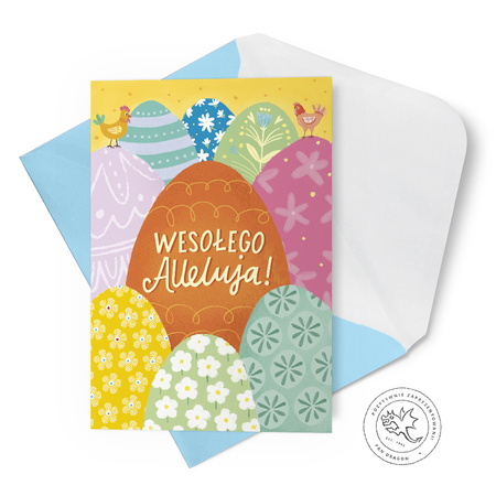 Radosna kartka wielkanocna z kolorowymi pisankami i kurkami wprowadza świąteczny, ciepły nastrój. Starannie wykonana z wysokiej jakości papieru i ozdobiona błyszczącym lakierem punktowym, który podkreśla wzory i nadaje efekt trójwymiarowości.