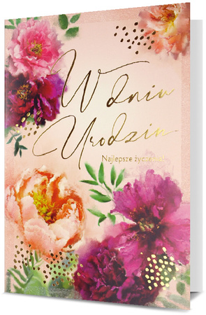 Zjawiskowa kartka urodzinowa, która zachwyca swoim kwiatowym, pełnym kolorów designem. Na froncie widnieją piwonie i kwiaty ogrodowe w odcieniach różu, czerwieni i brzoskwini. Całość dopełnia elegancki złocony napis "W Dniu Urodzin – Najlepsze życzenia!", podkreślający luksusowy charakter kartki.