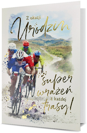 Wyjątkowa kartka urodzinowa stworzona z myślą o miłośnikach kolarstwa i sportowych emocji. Na froncie widnieje dynamiczny obraz rowerzystów na trasie, uzupełniony złoconym napisem "Z okazji Urodzin – Super wrażeń z każdej trasy!". Idealna dla pasjonatów sportu i aktywnego stylu życia.