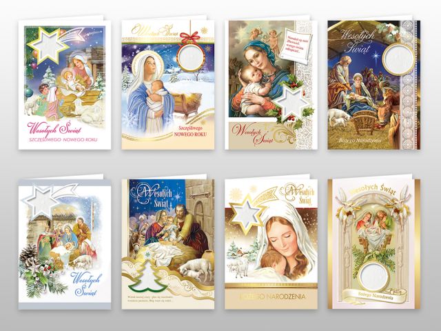 Karnet świąteczny z opłatkiem. Uszlachetniony złoconymi i tłoczonymi elementami graficznymi. Wewnątrz karnetu wklejony duży opłatek. Kolorowy środek kartki zawiera tekst życzeń. Pakowany wraz z kopertą w torebkę foliową.