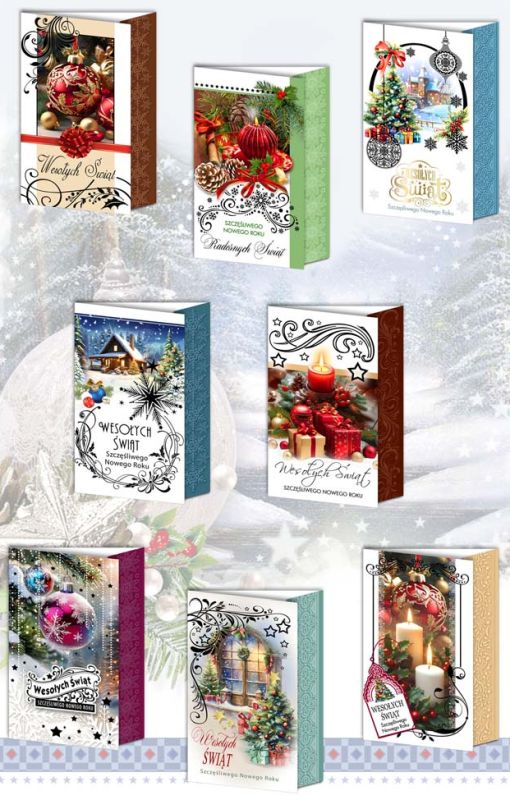 Seria przedstawia klasyczne, ¶wieckie motywy ¶wi±teczne: choinki, ¶wiece, bombki, zimowe pejza¿e i stroiki. Karnety s± lakierowane lakierem UV, maj± asymetryczny sk³ad z marginesem i kolorowy rewers, dziêki czemu prezentuj± siê bardzo elegancko i ¶wi±tecznie. Ka¿da kartka jest pakowana pojedynczo w przezroczysty woreczek foliowy z kolorow± kopert±, gotowa do ekspozycji i sprzeda¿y.