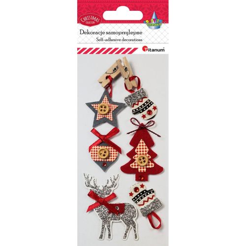Zestaw świątecznych naklejek 3D Titanum to szybki sposób, aby dodać projektom wyjątkowego, przytulnego klimatu. Elementy wykonane są na miękkiej piance samoprzylepnej, dzięki czemu mają efekt przestrzenny i świetnie prezentują się na kartkach, albumach, prezentach, stroikach czy dekoracjach DIY. W zestawie znajdziesz klasyczne bożonarodzeniowe motywy: gwiazdkę, bombkę, renifera, choinkę oraz ozdobne serduszka – w ciepłej, folkowej stylistyce z drobnymi dodatkami jak guziczki czy kokardki.