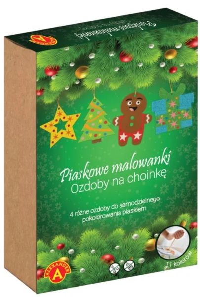 „Piaskowe Malowanki – Ozdoby na Choinkę” to zestaw, który zamienia dziecięcą wyobraźnię w prawdziwe, kolorowe dekoracje. W środku znajdziesz cztery wzory: gwiazdkę, choinkę, prezent i uroczego ciastka oraz 11 woreczków z kolorowym piaskiem. Wystarczy odkleić fragment samoprzylepnego obrazka i posypać go piaskiem, by stworzyć małe dzieło sztuki.