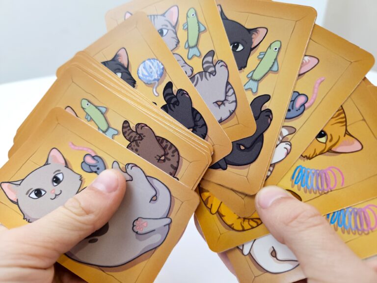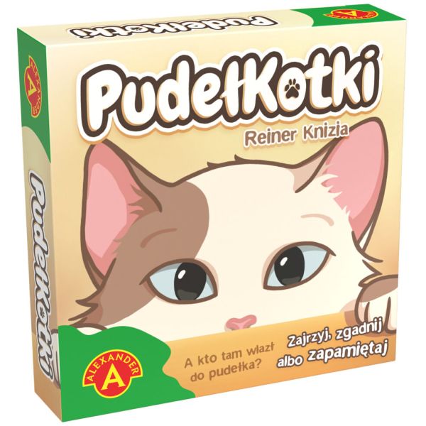 PudełKotki to lekka pamięciówka nie tylko dla miłośników kotów. Należy zapamiętać barwę i umaszczenie naszych pupilków (np. łatki, paski) oraz ich zabawkę. Na stół wykładamy karty z wizerunkiem pudełek, w których ukrywają się kotki. Każda karta to różna kombinacja trzech elementów. Rzut kośćmi wskaże, o którą kartę i o jaki atrybut chodzi. Jeśli pamiętasz (lub zgadniesz), wygrywasz.