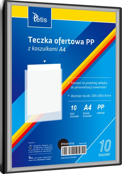 Teczka ofertowa TETIS wykonana z wysokiej jakości tworzywa PP to niezawodne narzędzie do prezentacji dokumentów w formacie A4. Wyposażona w 10 przezroczystych koszulek oraz kieszeń na przedniej okładce, umożliwia personalizację zawartości i estetyczne przygotowanie ofert, projektów czy materiałów biurowych. Solidny grzbiet zapewnia trwałość i wygodę użytkowania, a elegancki czarny kolor dodaje profesjonalizmu każdej prezentacji.