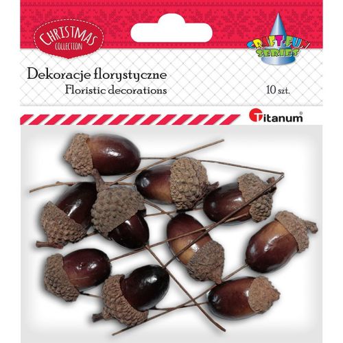 Producent: Titanum KreatywneŻołędzie wykonane z drobnoziarnistego styropianu, na druciku w kolorze brązowym. Opakowanie 10 szt.