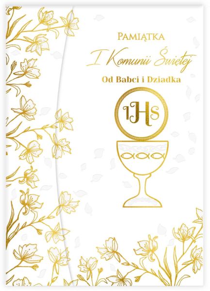 Ten wyjątkowy album komunijny to subtelna i elegancka forma wyrażenia miłości oraz wsparcia duchowego. Zdobiony pięknym motywem złotych lilii oraz hostii z kielichem IHS, stanowi wzruszający prezent od Babci i Dziadka. Na okładce znajduje się złocony napis: „Pamiątka I Komunii Świętej – Od Babci i Dziadka”, co czyni go jeszcze bardziej osobistym i symbolicznym.