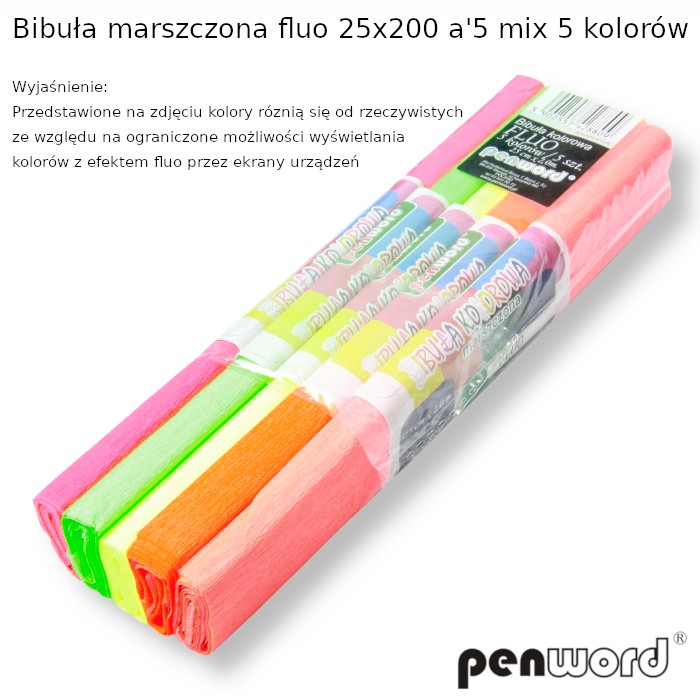 Strona główna » Oferta » Bibuły » Bibuły Marszczone » Bibuła Mix Kolorów » BIBUŁA MARSZCZONA FLUO 25x200 a5 MIX 5 KOLORÓW
