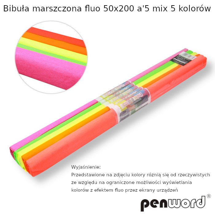 Strona główna » Oferta » Bibuły » Bibuły Marszczone » Bibuła Mix Kolorów » BIBUŁA MARSZCZONA FLUO 50x200 a5 MIX 5 KOLORÓW