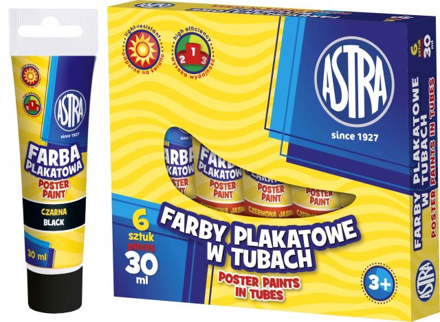 Producent: Astra- Farby plakatowe są farbami wodnymi, kryjącymi o czystych i intensywnych barwach.