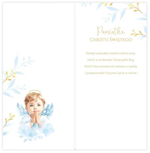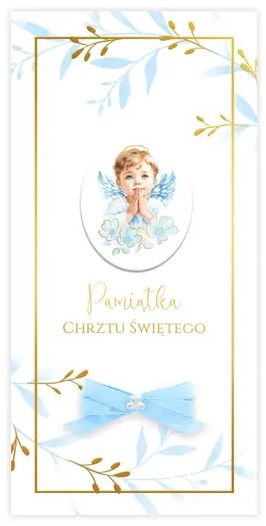 Producent: Kartki z KotkiemElegancka i tradycyjna kartka DL na Chrzest ¦wiêty dla ch³opca to subtelna propozycja utrzymana w pastelowej kolorystyce. Na froncie znajduje siê ilustracja anio³ka z modlitewnym gestem, otoczonego niebieskimi ga³±zkami i z³oconymi akcentami. Doln± czê¶æ zdobi delikatna niebieska kokardka, która dodaje ca³o¶ci trójwymiarowego efektu i miêkko¶ci. Napis „Pami±tka Chrztu ¦wiêtego” zosta³ wykonany eleganck± czcionk±, wpisan± w z³ot± ramkê. Ca³o¶æ tworzy spójn±, uroczyst± kompozycjê.
