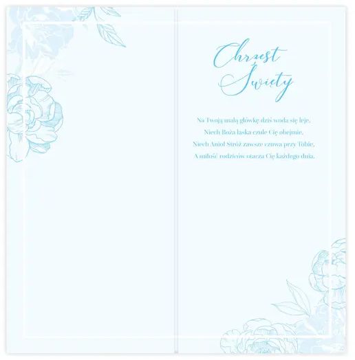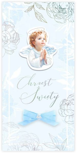 Producent: Kartki z KotkiemTa kartka DL na Chrzest Święty wyróżnia się pastelową kompozycją w odcieniach błękitu oraz motywem modlącego się aniołka. Tło zdobi subtelny rysunek kwiatów, nadający całości lekkości i spokoju. Napis „Chrzest Święty” wykonano stylową, kaligraficzną czcionką. W dolnej części umieszczono błękitną kokardkę z perełką, która dodaje kartce przestrzenności i eleganckiego wykończenia. Projekt łączy w sobie klasykę i nowoczesność – idealny do prezentów pieniężnych i pamiątkowych.