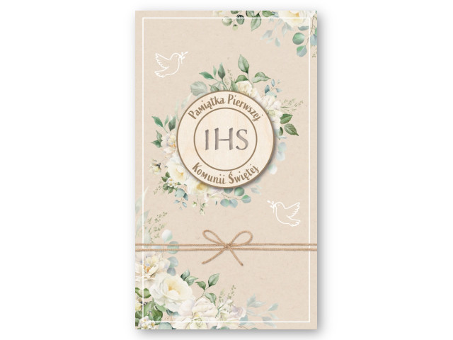 Ekskluzywny karnet komunijny w formacie 13x21cm to elegancka pamiątka przygotowana na uroczystość Pierwszej Komunii Świętej. Na froncie znajduje się dekoracyjna grafika z symbolem IHS w centralnym medalionie, otoczonym subtelną kompozycją kwiatową w jasnych, naturalnych odcieniach. Całość uzupełniają delikatne motywy gołąbków oraz ozdobna kokardka, które nadają kartce lekki, uroczysty i bardzo estetyczny charakter. Perłowy papier podkreśla szlachetność wykonania, a złocenie lub srebrzenie efektownie eksponuje najważniejsze detale projektu. Bogata forma sprawia, że karnet doskonale prezentuje się na ekspozycji i świetnie wpisuje się w ofertę komunijną premium.