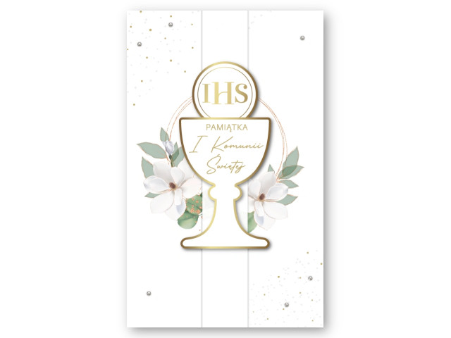 Luksusowy karnet na I Komunię Świętą to elegancka pamiątka o wyjątkowo estetycznym i uroczystym charakterze. Na froncie znajduje się dekoracyjna, przestrzenna grafika w kształcie kielicha komunijnego z symbolem IHS, uzupełniona subtelnymi kwiatowymi zdobieniami i delikatnymi detalami na jasnym tle. Całość prezentuje się bardzo stylowo, a elementy złocenia lub srebrzenia pięknie podkreślają najważniejsze części projektu. Wykonanie na specjalnym, grubym kartonie nadaje kartce trwałość i elegancki wygląd, a liczne dodatki wzmacniają efekt premium.