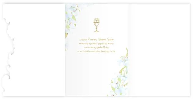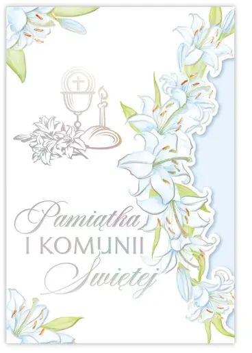 Elegancka kartka komunijna B6 LUX w błękitnej kolorystyce to doskonała propozycja dla klientów poszukujących estetycznych i starannie wykonanych wzorów na Pierwszą Komunię Świętą. Motyw lilii oraz kielicha eucharystycznego podkreśla uroczysty i religijny charakter produktu, a pastelowy błękit w połączeniu ze złoceniem tworzy harmonijną, spokojną kompozycję. Kartka jest składana na trzy części i zawiera gotowe życzenia w środku, dzięki czemu stanowi produkt gotowy do wręczenia. Dodatkowe tłoczenie podkreśla eleganckie wykończenie i nadaje całości efekt premium.