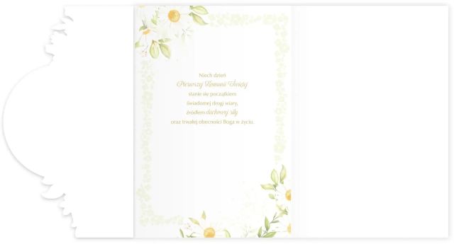 Elegancka kartka komunijna B6 LUX to wyjątkowa propozycja na Pierwszą Komunię Świętą, utrzymana w subtelnej, jasnej kolorystyce z dekoracyjnym motywem margaretek. Delikatne kwiatowe zdobienia, złocone detale oraz efektowne elementy przestrzenne nadają kartce elegancki i uroczysty charakter. Produkt został starannie wykonany z wysokiej jakości papieru, dzięki czemu doskonale sprawdza się jako estetyczna i gotowa do wręczenia kartka na tę szczególną okazję. Wewnątrz znajdują się gotowe życzenia religijne.