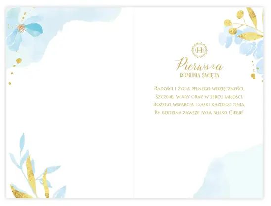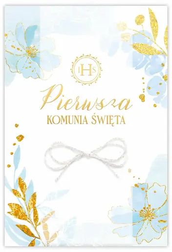 Elegancki karnet komunijny B6 LUX dla chłopca to wyjątkowa propozycja na Pierwszą Komunię Świętą, łącząca klasyczną symbolikę religijną z subtelną, dekoracyjną oprawą. Delikatne motywy kwiatowe w błękitnej kolorystyce, złocone detale oraz ozdobna kokardka nadają kartce lekkości i eleganckiego charakteru. Produkt został starannie wykonany z wysokiej jakości papieru, dzięki czemu doskonale sprawdza się jako estetyczna i gotowa do wręczenia kartka na tę wyjątkową okazję. Wewnątrz znajdują się gotowe życzenia oraz miejsce na własną dedykację.