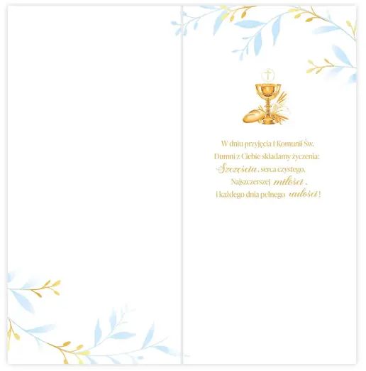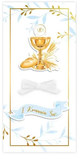 Kartka DL wykonana z najwyższą starannością, stanowi połączenie nowoczesnego wzornictwa z elegancją, dzięki czemu jest doskonałym wyborem na przyjęcie I Komunii Świętej. Zaprojektowana z użyciem akwarelowych ilustracji - akwarelowy kielich z kłosami i chlebem, zachwyca połączeniem złocenia z delikatnymi pociągnięciami farby. Ręcznie wiązana kokardka to wyjątkowy element dekoracyjny.