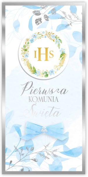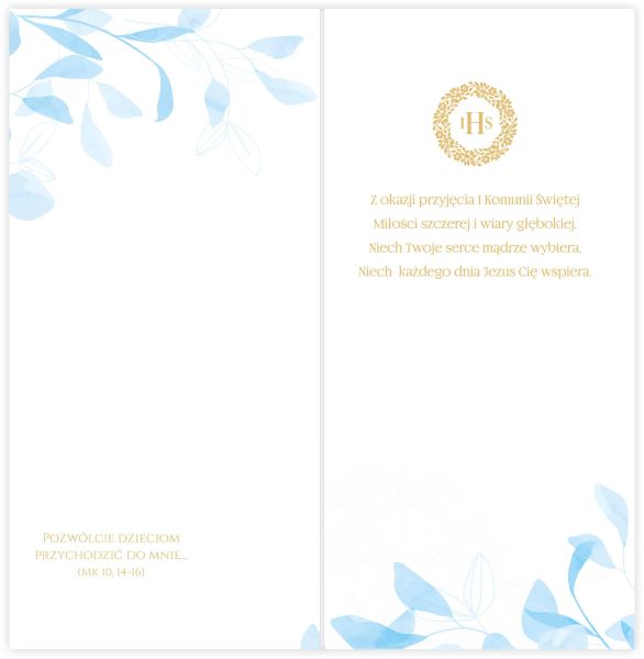 Ręcznie robiona kartka komunijna DL w eleganckim, akwarelowym stylu to doskonały wybór na prezent z okazji Pierwszej Komunii Świętej dla chłopca. Subtelne złocenia, przestrzenny motyw IHS i ręcznie wiązana kokardka nadają jej wyjątkowy charakter.