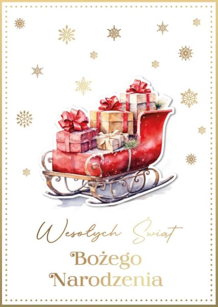 🎄 Kartka „Sanie ¦wiêtego Miko³aja z prezentami” to ponadczasowy wzór, który doskonale sprzedaje siê w sezonie ¶wi±tecznym. Przyci±ga uwagê z³oconymi detalami i efektownym, przestrzennym wykonaniem – idealna do ekspozycji w witrynach sklepowych i na stojakach z karnetami.