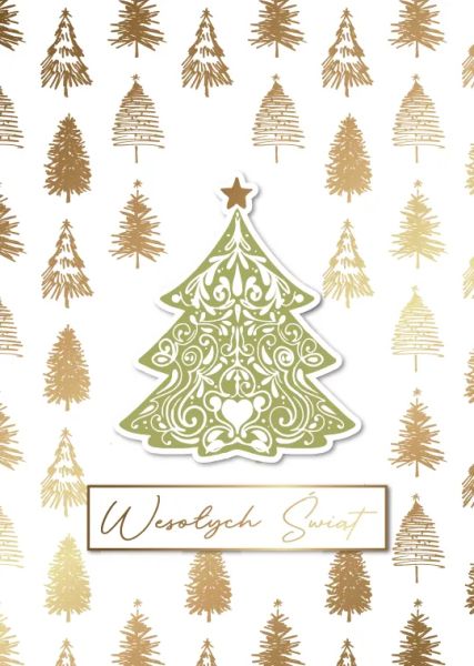 Stylowa kartka świąteczna od ARMIN STYLE zachwyca elegancją i minimalistycznym designem. Na froncie znajduje się ozdobna, zielona choinka o misternym, dekoracyjnym wzorze, otoczona tłem pełnym złoconych drzewek. Całość dopełnia delikatny napis „Wesołych Świąt” w klasycznej, kaligraficznej czcionce, który nadaje kartce szyku i świątecznego uroku.