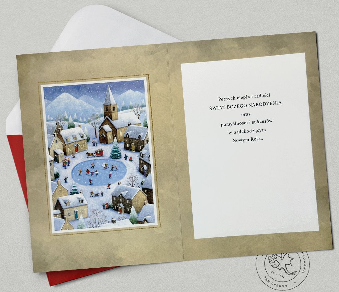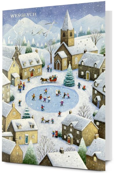 Urokliwa kartka świąteczna z serii Star od PAN DRAGON przenosi nas w malowniczy, zimowy pejzaż małego miasteczka. Na środku placu dzieci i dorośli z radością ślizgają się po lodowisku, a wokół rozświetlone domy i kościół tworzą ciepły, rodzinny klimat Bożego Narodzenia. To idealny karnet dla wszystkich, którzy cenią tradycyjny, nastrojowy styl świątecznych ilustracji.