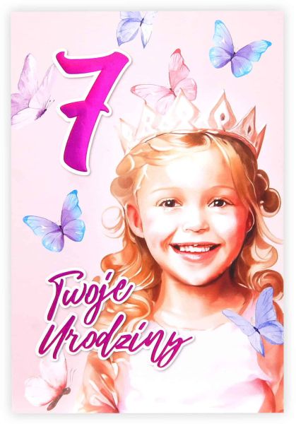 Urocza kartka urodzinowa z motywem uśmiechniętej dziewczynki w koronie to idealny wybór na siódme urodziny dla małej księżniczki! Pastelowe tło w odcieniach różu, unoszące się motyle i błyszcząca cyfra „7” tworzą bajkową kompozycję, która zachwyca subtelnością i radością. Kartka wykonana z wysokiej jakości papieru i ozdobiona metaliczną folią to wyjątkowa pamiątka pełna dziecięcego uroku.