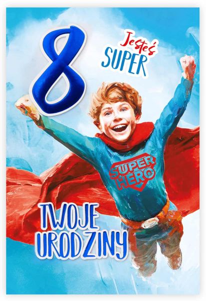 Kartka urodzinowa dla dziecka KZK B6 Nr 029, na 8 urodziny z Superbohaterem
