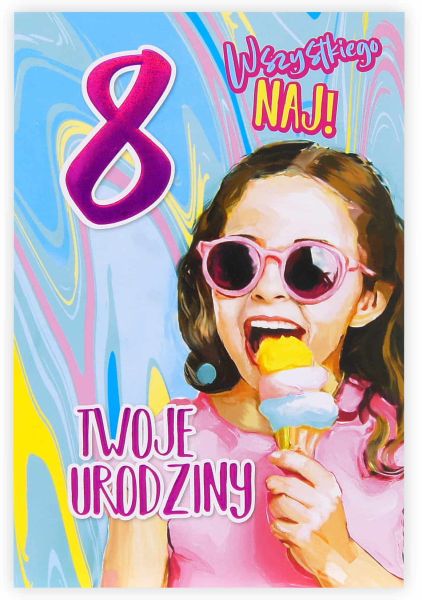 Kolorowa i pełna radości kartka urodzinowa z motywem dziewczynki zajadającej lody to doskonały wybór na ósme urodziny! Radosna ilustracja, błyszcząca cyfra „8” i napis „Wszystkiego naj!” tworzą nowoczesny, pełen pozytywnej energii wzór, który idealnie oddaje beztroski nastrój dzieciństwa. Kartka została wykonana z wysokiej jakości papieru i ozdobiona połyskującą folią metaliczną, dzięki czemu pięknie się mieni i przyciąga uwagę.