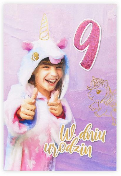 Przepiękna, bajecznie kolorowa kartka od producenta Kartki z Kotkiem, stworzona z myślą o dziewczynkach świętujących swoje 9 urodziny. Na okładce wesoła dziewczynka w stroju jednorożca i duża, połyskująca cyfra 9 – symbol magii, radości i marzeń! Idealna propozycja dla małej miłośniczki jednorożców i pastelowych kolorów.