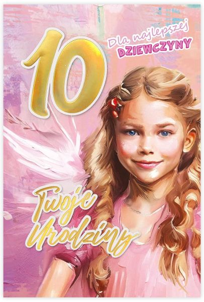 Urocza kartka od producenta Kartki z Kotkiem, przygotowana specjalnie z myślą o dziewczynkach obchodzących 10 urodziny. Na okładce śliczna dziewczynka w pastelowych barwach z anielskim skrzydłem i dużą, złoconą cyfrą 10 – symbol elegancji i wyjątkowego dnia! Napis „Dla najlepszej dziewczyny” sprawia, że to idealny wybór dla małej damy pełnej wdzięku i radości.