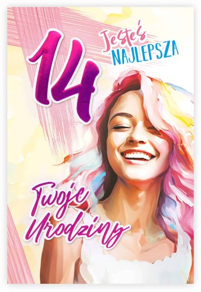Pełna energii, stylu i młodzieżowej lekkości – idealna kartka dla 14-letniej dziewczyny, która kocha wyraziste kolory i pozytywny vibe. Duża, tłoczona cyfra „14” w intensywnym fioletowo-różowym odcieniu natychmiast przyciąga wzrok, a ilustracja uśmiechniętej nastolatki z kolorowymi włosami tworzy modny, artystyczny klimat. W środku znajdują się barwne życzenia, a całość uzupełnia dopasowana koperta.