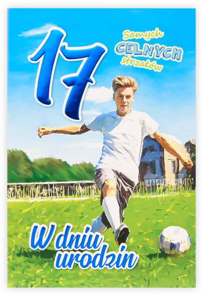 Świetny wybór dla 17-latka, który żyje futbolem. Duża, tłoczona cyfra „17” w intensywnym niebieskim odcieniu wyróżnia się na tle jasnego, słonecznego krajobrazu. Ilustracja młodego piłkarza w trakcie dynamicznego strzału dodaje kartce energii i sportowego charakteru. W środku znajdują się barwne życzenia, a całość uzupełnia dopasowana koperta.