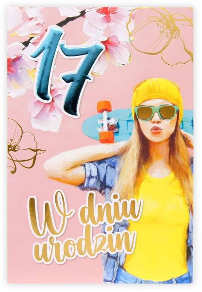 Nowoczesna, świeża i pełna młodzieżowego vibe’u – idealna na 17. urodziny dziewczyny, która lubi styl streetwear, sportowe dodatki i pastelowe klimaty. Duża, tłoczona cyfra „17” w chłodnym odcieniu pięknie kontrastuje z różowym tłem ozdobionym kwiatami wiśni. Ilustracja dziewczyny z deskorolką, w okularach i czapce, nadaje kartce charakter modny i lekko buntowniczy. W środku znajdują się życzenia, a całość dopełnia dopasowana koperta.