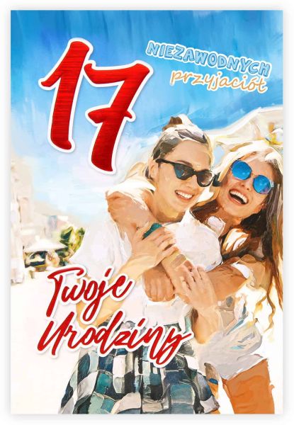 Pełna dobrej energii, uśmiechów i letniej swobody – idealna kartka na 17. urodziny dziewczyny, która ceni przyjaźń i wspólne chwile. Duża, tłoczona cyfra „17” w intensywnej czerwieni od razu przyciąga wzrok, a ilustracja dwóch roześmianych przyjaciółek nadaje kartce ciepły, pozytywny charakter. W środku znajdują się kolorowe życzenia, a całość uzupełnia dopasowana koperta.