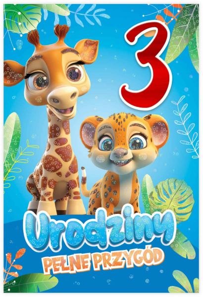 Kolorowa kartka urodzinowa z sympatycznymi zwierzakami z dżungli – żyrafką i małym lampartem – to doskonały wybór na trzecie urodziny dziecka! Intensywnie błękitne tło i duża, błyszcząca cyfra „3” sprawiają, że kartka wygląda radośnie i nowocześnie. Wykonana z wysokiej jakości papieru i ozdobiona metaliczną folią, zachwyca każdym szczegółem i stanowi idealny dodatek do prezentu dla małego odkrywcy.